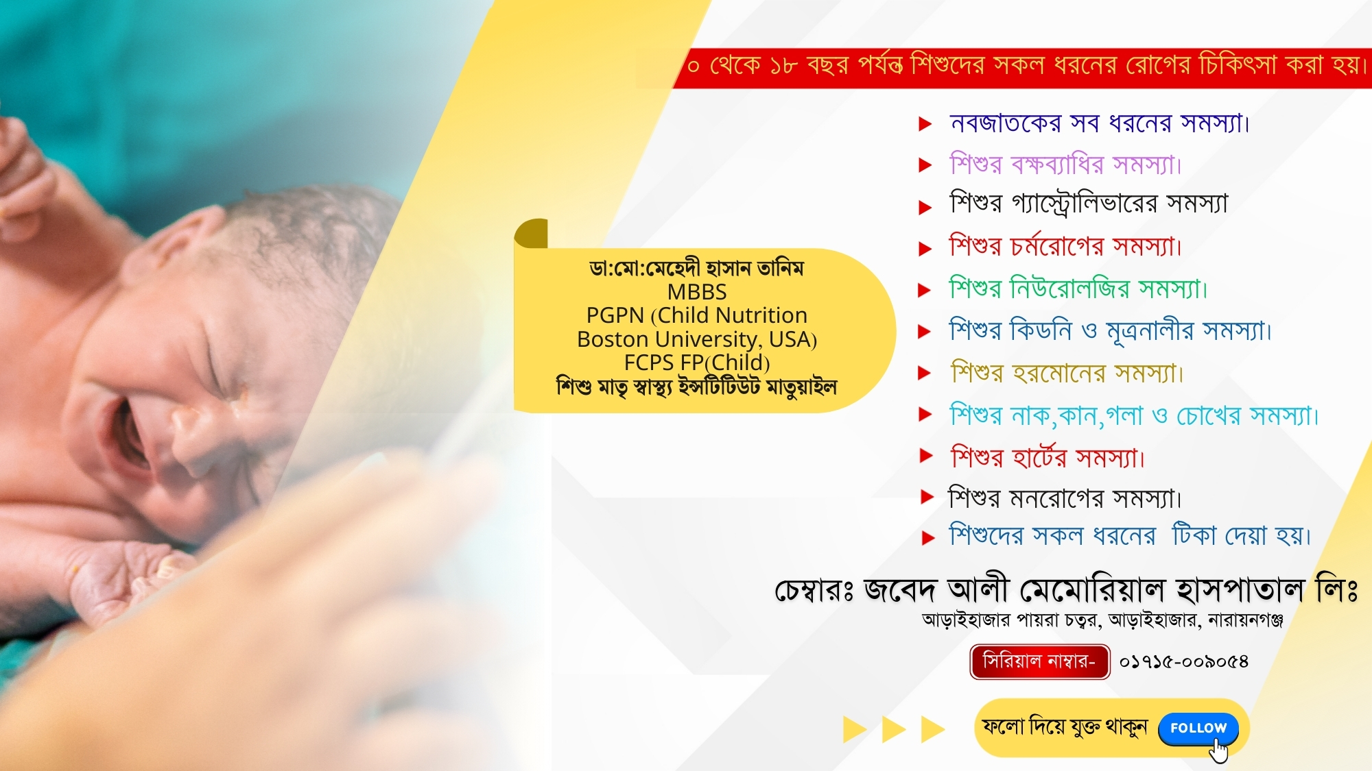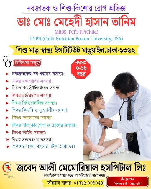 শিশুদের যেকোন সমস্যায় আমি আছি আপনাদের পাশে। অভিজ্ঞ শিশু ডাক্তারের নিয়মিত চেকআপে থাকুন নিশ্চিন্ত। আপনি কি শিশুর জন্য অভিজ্ঞ ডাক্তার খুজছেন?