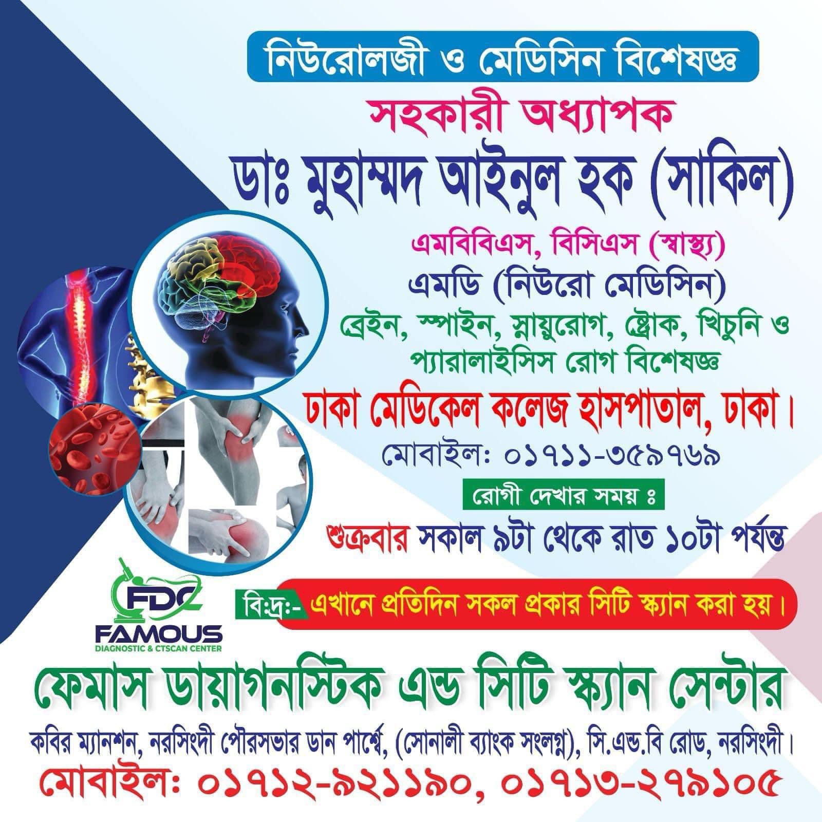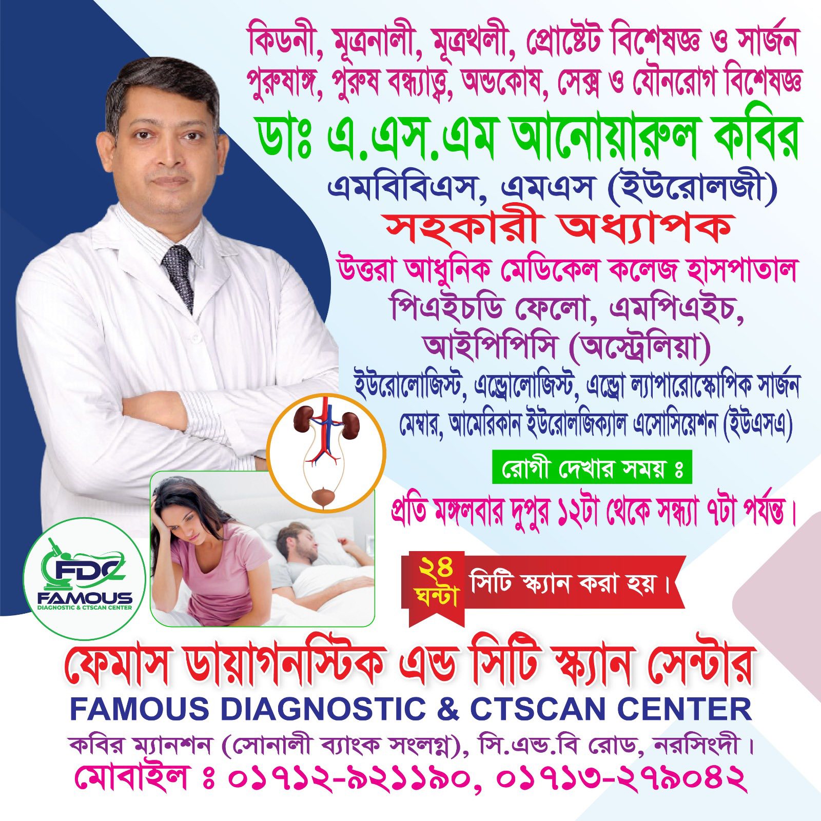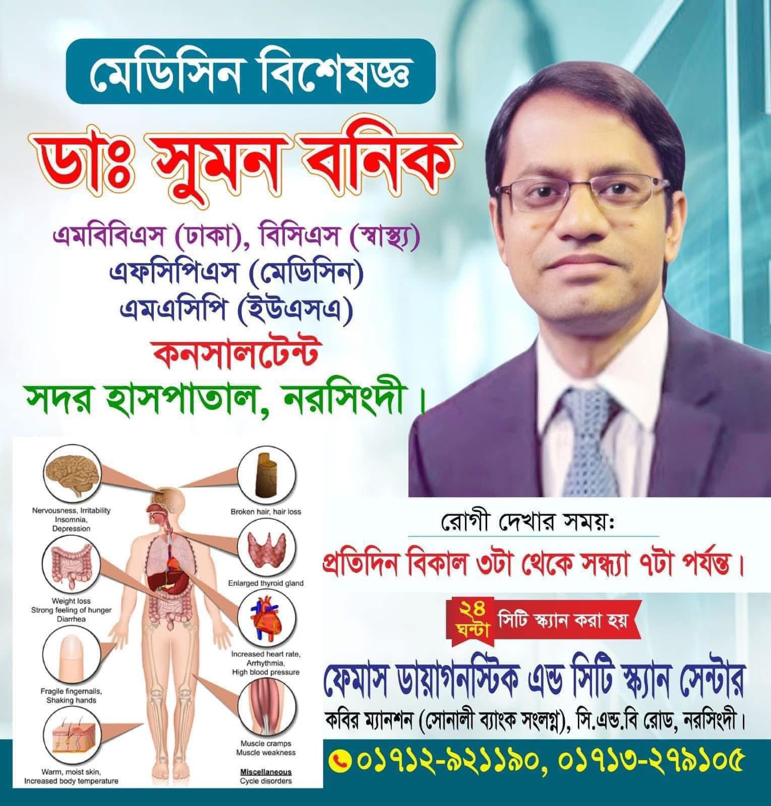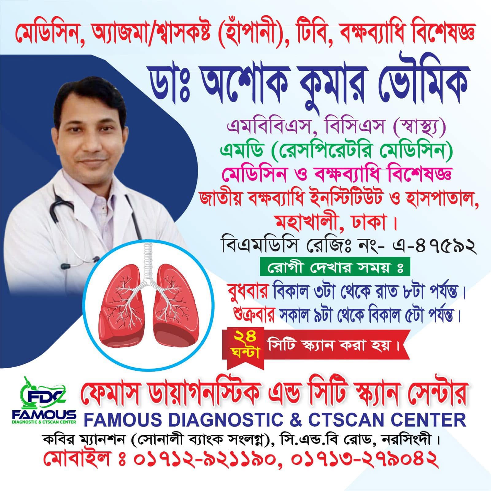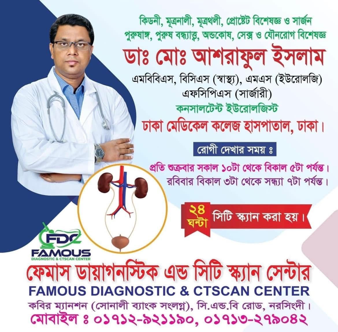 আপনাদেরকে অতি আনন্দের সাথে জানাচ্ছি যে, ফেমাস ডায়াগনস্টিক এন্ড সিটি স্ক্যান সেন্টার এ আপনারা এখন থেকে দেশ বরেণ্য বিশেষজ্ঞ চিকিৎসকবৃন্দের এর সেবা লাভ করবেন। নিন্মে প্রদত্ত সময়-সূচি দেখে চলে আসুন বিশেষজ্ঞ চিকিৎসকের সেবা গ্রহণে।