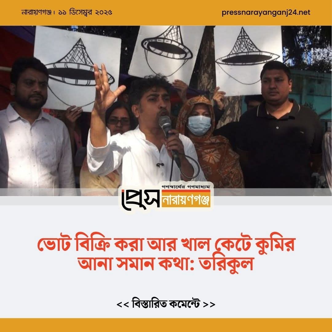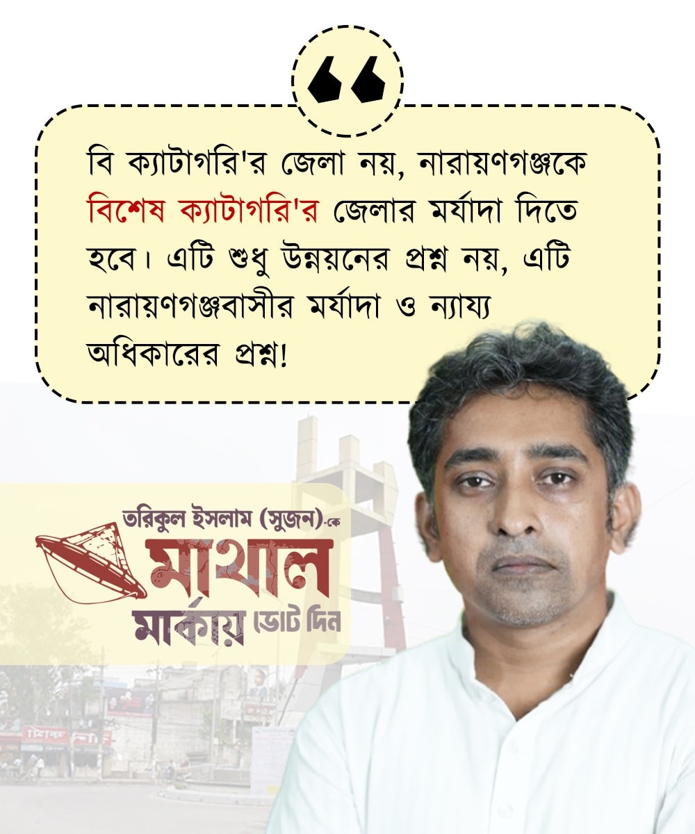 বি ক্যাটাগরি'র জেলা নয়, নারায়ণগঞ্জকে বিশেষ ক্যাটাগরি'র জেলার মর্যাদা দিতে হবে। এটি শুধু উন্নয়নের প্রশ্ন নয়, এটি নারায়ণগঞ্জবাসীর মর্যাদা ও ন্যায্য অধিকারের প্রশ্ন: তরিকুল সুজন।